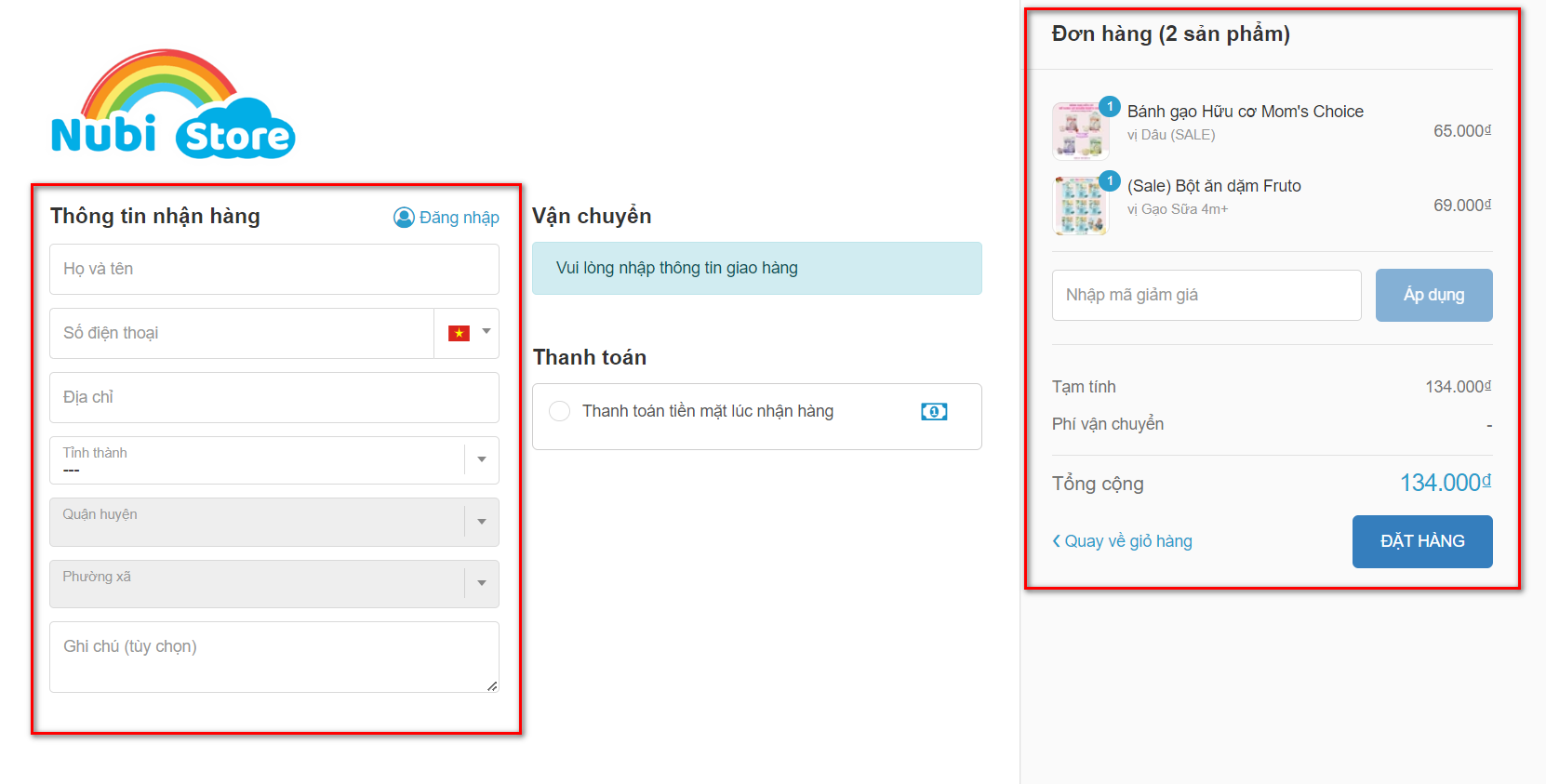- Sau khi điền đầy đủ thông tin và kiểm tra lại đơn hàng, giá tiền, bạn hãy bấm vào nút HOÀN TẤT ĐƠN HÀNG gửi về cho Nubi Store