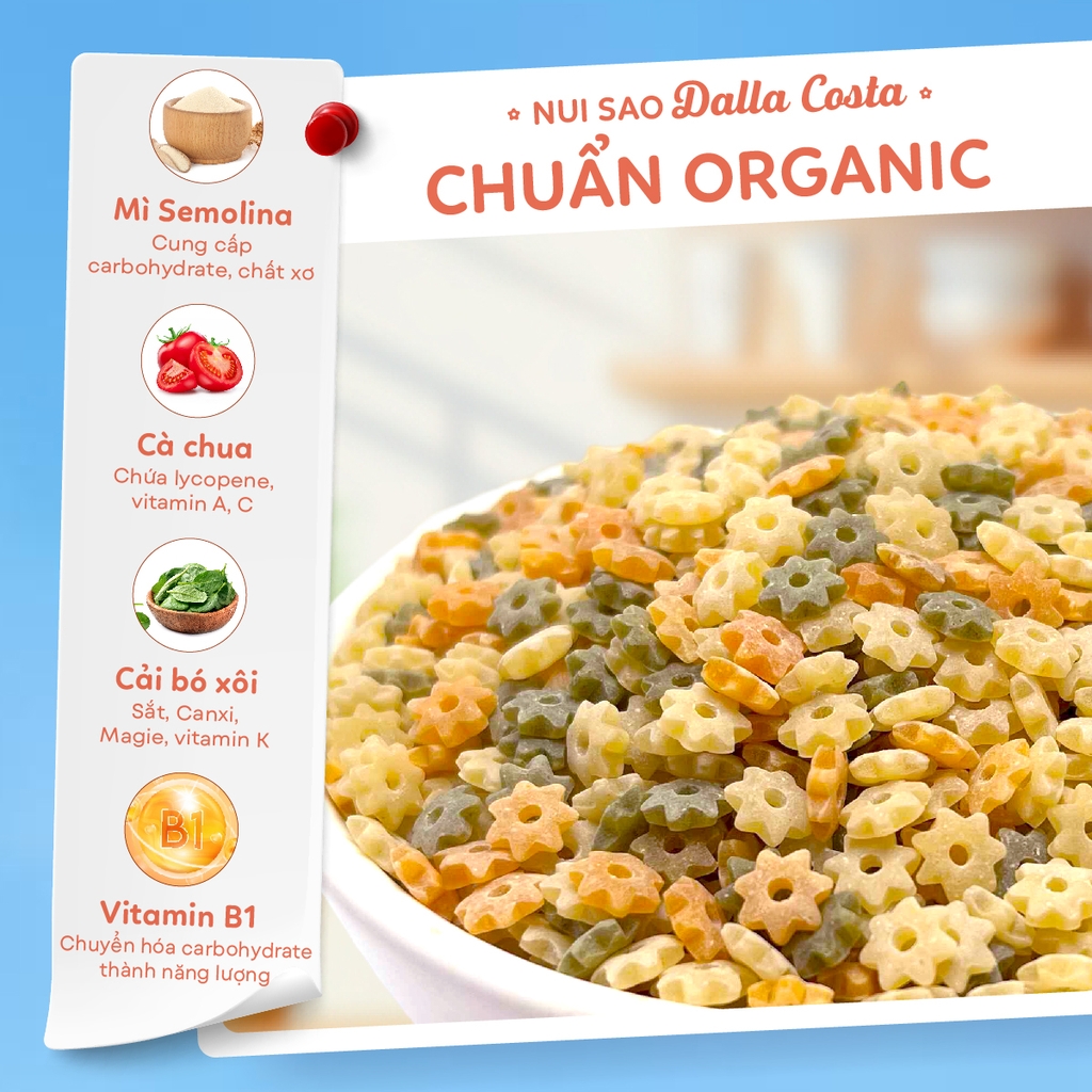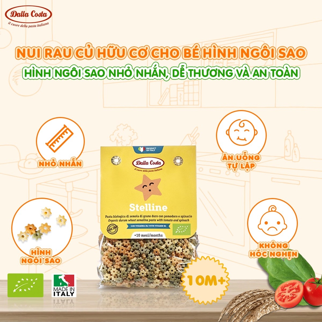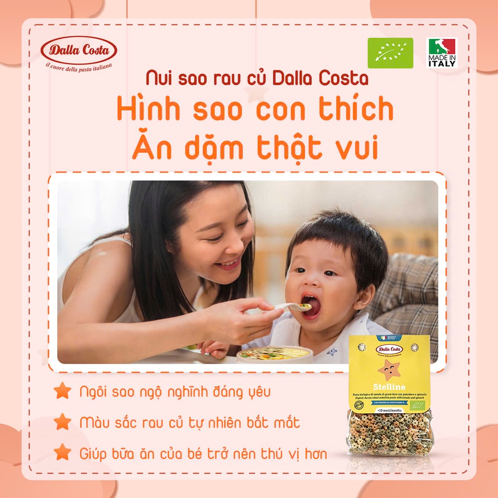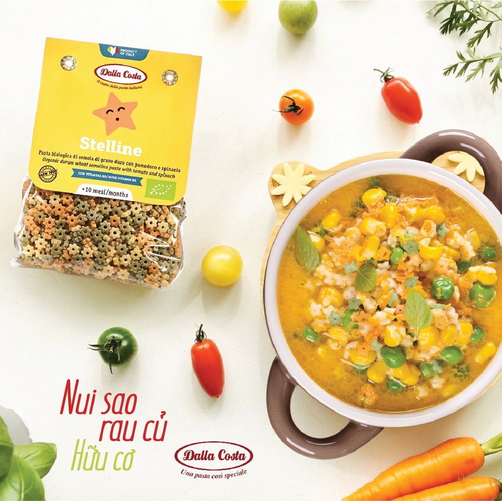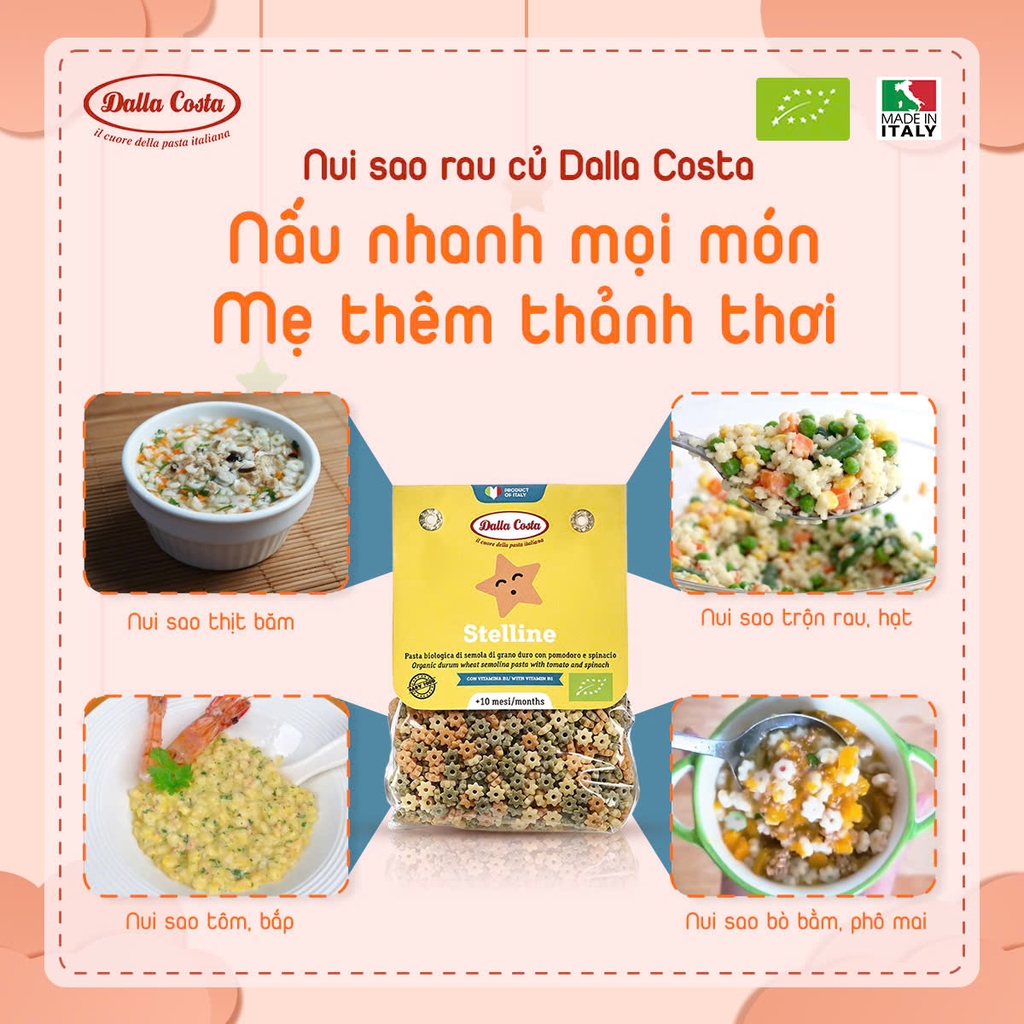 CÁC MÓN ĂN GỢI Ý : Nui sao rau củ hữu cơ Dalla Costa mẹ luộc 1 lượng vừa đủ rồi nấu thêm nước dùng như soup/ canh/ nước hầm xương hoặc cho bé dùng kèm nước dùng Dashi Pigeon cho tiện ạ.