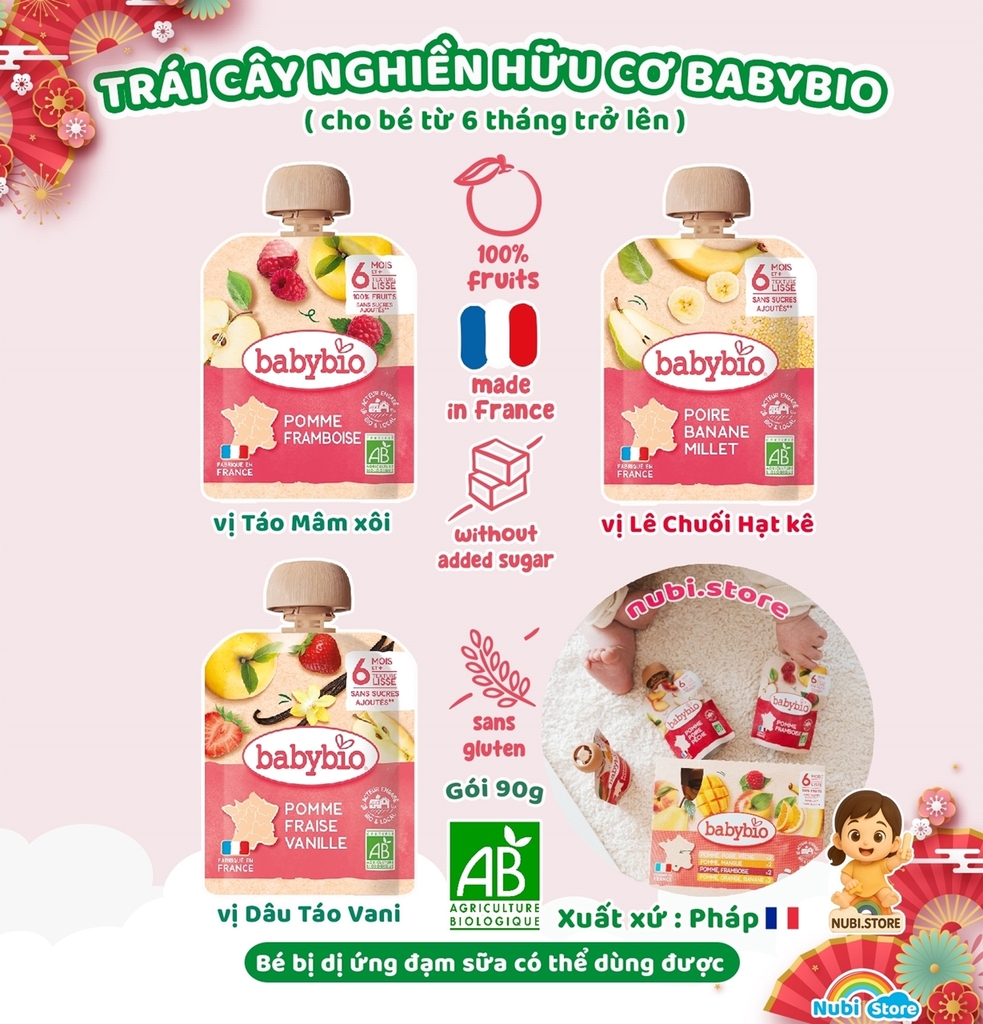 Trái cây nghiền Hữu cơ Babybio với thành phần từ 100% hoa quả hữu cơ, không thêm đường tốt cho sự phát triển toàn diện của trẻ. Sản phẩm hoàn toàn không chứa thành phần sữa nên mẹ có thể an tâm dùng cho các bé bị dị ứng đạm sữa nhé !